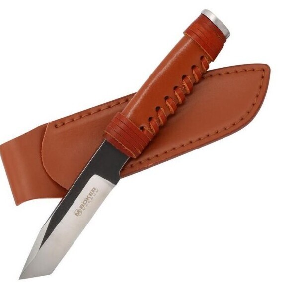 This massive 440 stainless steel blade with a thickness of 5.2 mm reaches full power through the handle. The leather handle is comfortable and secure in hand.