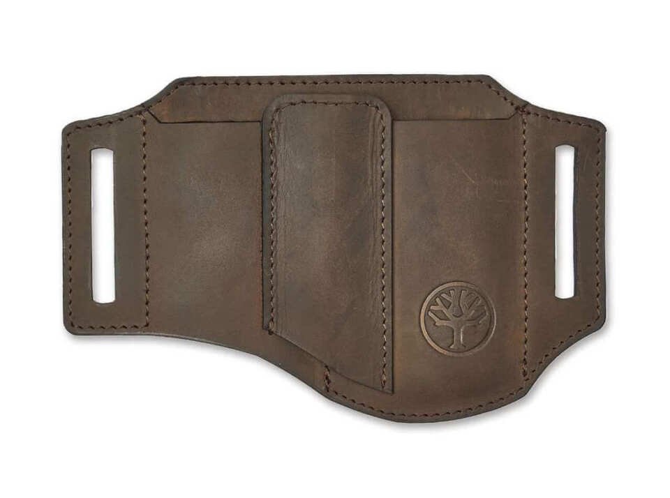 The high-quality Boker holster made of the most impressive nubuck leather can hold up to three items and is characterised by an extremely high level of carrying comfort. The large main compartment holds a pocket knife with a handle length of up to 10 centimetres, while the other two compartments are also open in the lower area and offer enough space for a compact torch as well as a pen or tactial pen. The Boker leather holster ED-Three is designed for a belt width of up to 4.4 centimetres and can be worn on the right or left side. The embossed Boker tree mark emblem sets a discreet accent and elegantly rounds off the classy look of the brown case.