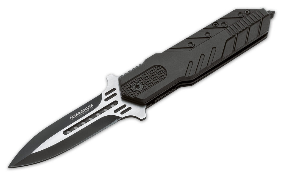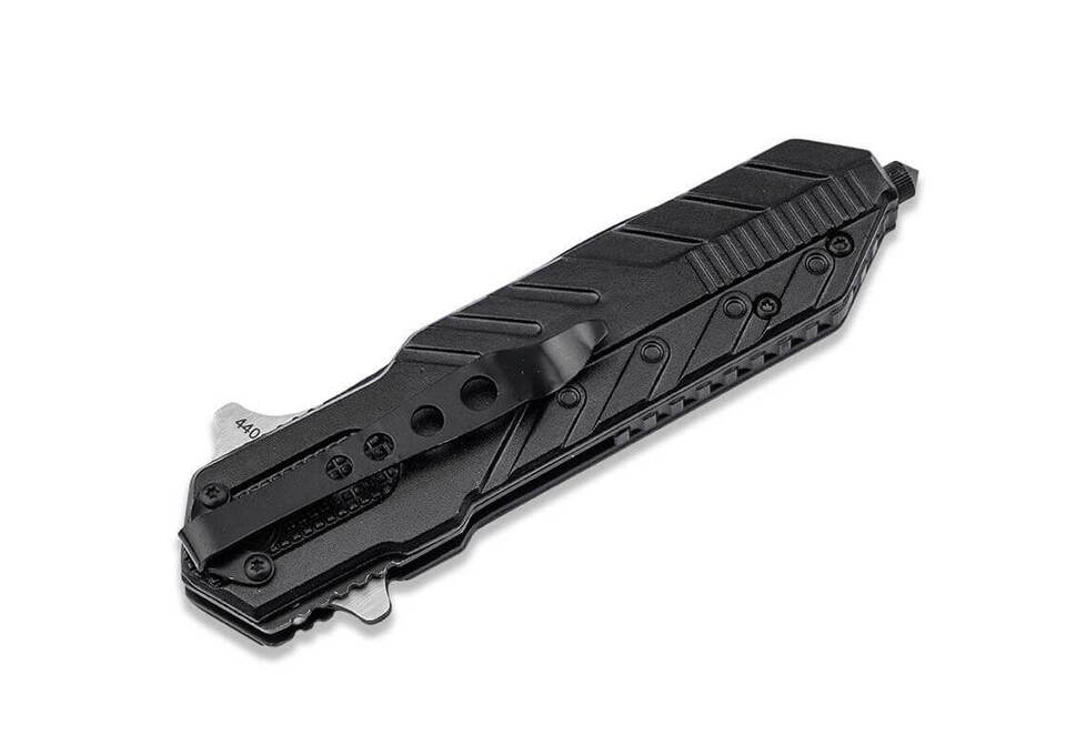 This unique tactical piece boasts a strikingly milled two-tone finish on the 440 stainless steel blade. The flipper provides for hand protection, and the aluminum scales house a steel liner, for the sturdy liner lock mechanism. Also features a glass breaker and pocket clip.