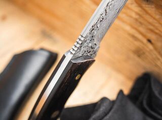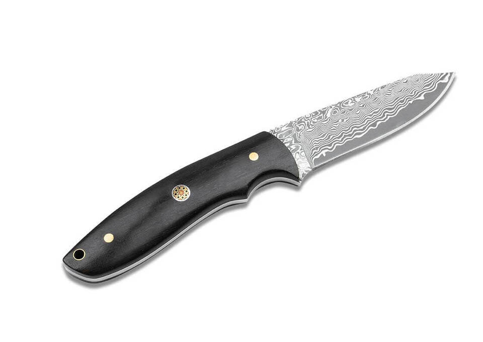 Exclusive features, including passion! Boker meets the endorphin deficiency of knife-loving enthusiasts with a finely-tuned dose of selected active ingredients. A noble drop-point blade made of 67 layers of Damascus in a two-tone pattern, characteristic ebony as handle material and an unbeatable price unfold the extra class in the Magnum Vernery Damascus. The outdoor knife is ideal for camping, bushcrafting or hunting. The full tang construction and the contoured handle of the fixed blade knife always ensure stability and a secure grip when it matters most. The classy appearance is rounded off by the contrasting brass studs in the handle, of which the middle one in particular stand out in an elaborately designed mosaic pattern. The lanyard hole is also made of brass and can be used to attach lanyards. The fixed blade is supplied with a high-quality leather sheath. Guaranteed prescription-free and an absolute Damascus - a must have for every knife fan!