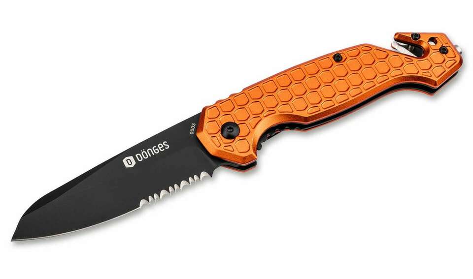 The Dönges Basic series is deliberately kept in a moderate and common pocket-knife size. This means that the knife can be carried in everyday life and can also be used for general cutting tasks. In an emergency, it is always at hand as a professional rescue tool in the unforeseen event of an emergency. The strong common features of all three models are the anodized handle scales made of 6061 aircraft aluminium with a non-slip Dönges honeycomb structure, blades made of tough 440A stainless steel with a biting half-shaft and ball-bearing axles, a glass-breaker, a belt-cutter and a reliable steel clip for tip-down/R carrying.
