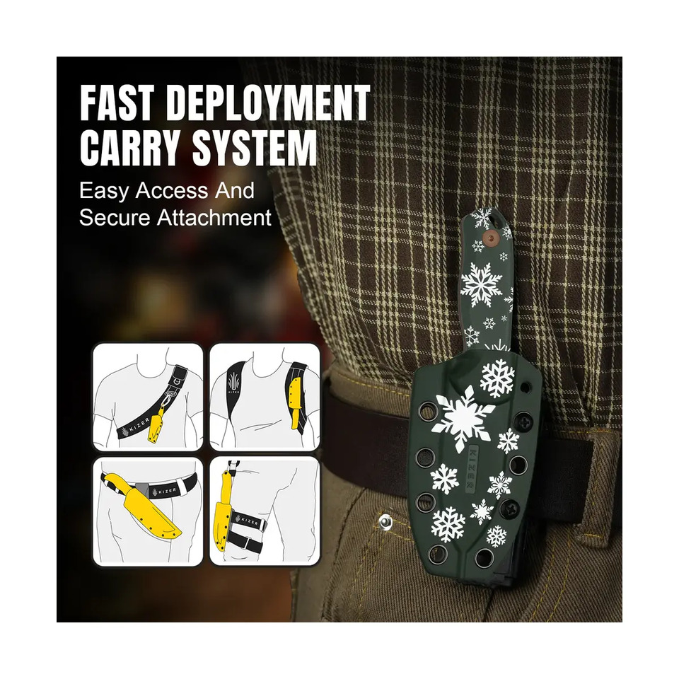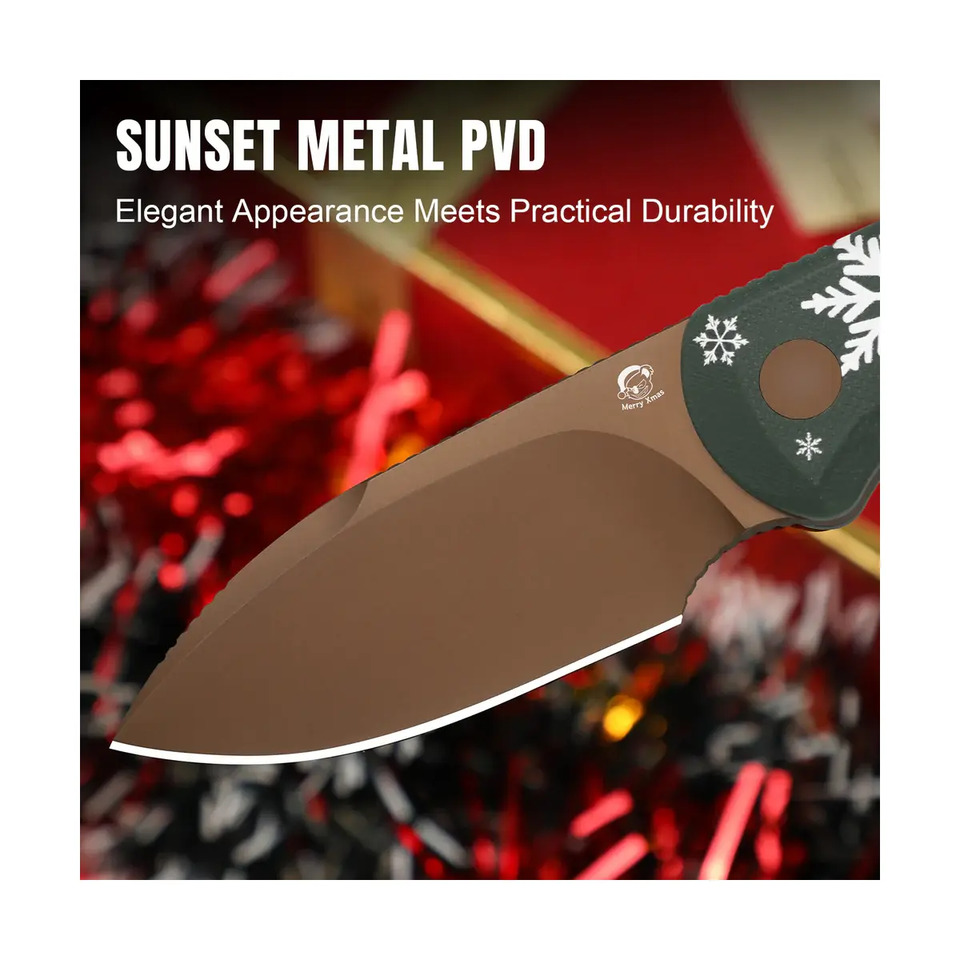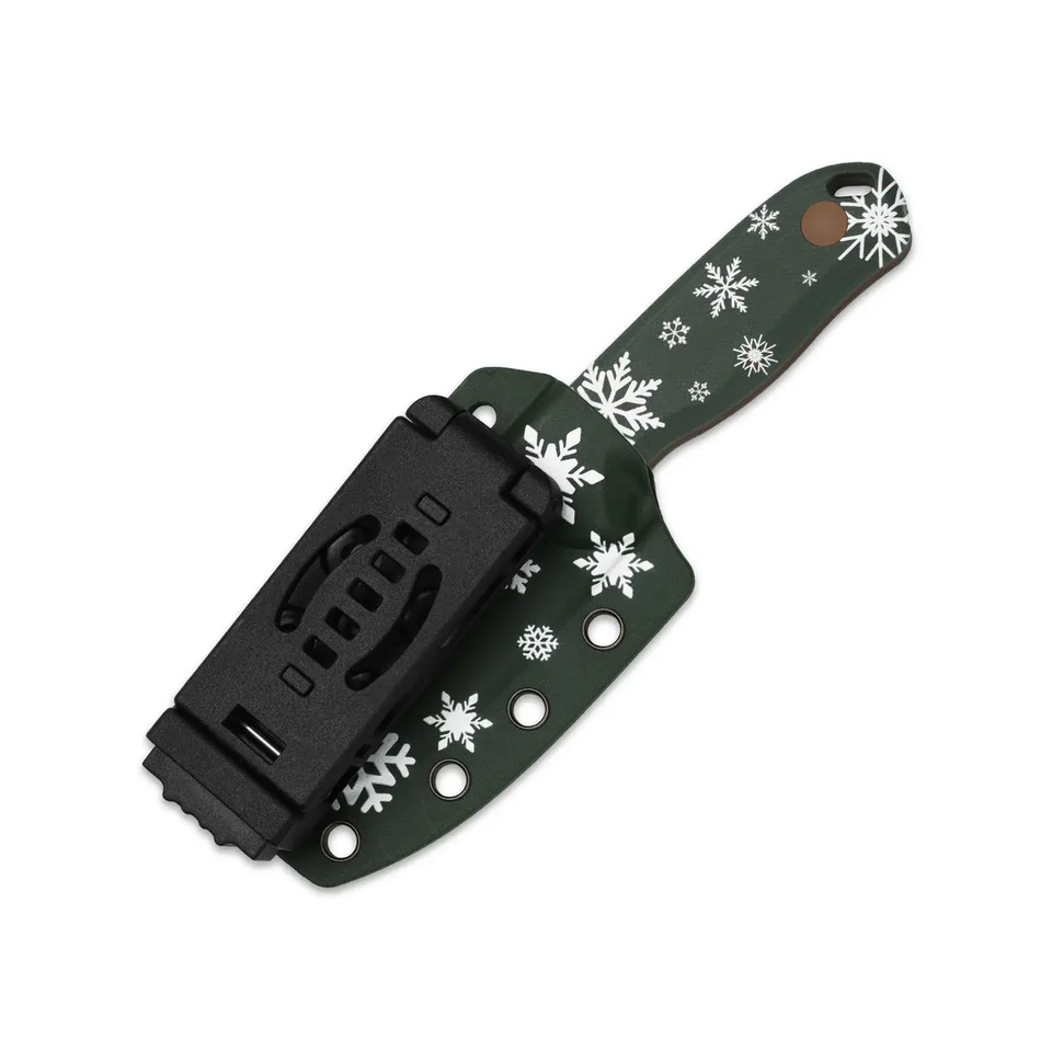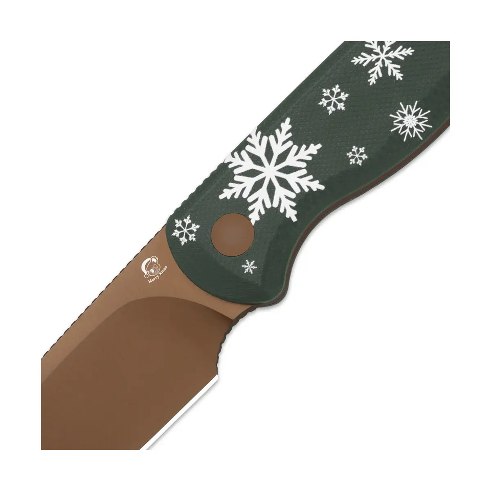 The exclusive Christmas edition of the Kizer Drop Bear combines design and functionality in an impressive way. Featuring a bronze-colored D2 blade and a forest green G10 handle adorned with delicate snowflakes, this knife stands out not only for its aesthetics but also for its performance. The full tang construction ensures maximum stability and optimal handling. Inspired by the Australian legend of the treacherous hunter, which resembles a koala and falls swiftly from the trees, the Drop Bear carries both myth and true cutting power. Equipped with a sharp 14C28N blade, this knife easily handles everyday cutting tasks with precision and efficiency. The handle, made from durable Micarta, offers excellent grip and makes the knife nearly invisible when pointed toward the sky. With a lanyard hole and a lanyard, the Drop Bear remains secure and within reach, whether used in outdoor settings or everyday situations. The Kizer Drop Bear is a versatile tool that combines both reality and myth, proving its worth in any circumstance.