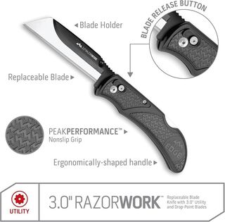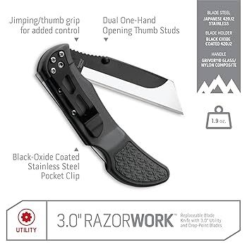 BLACK-OXIDE COATED BLADE HOLDER – Rigid 420J2 stainless steel blade holder supports the razor blade for the strength of a traditional knife and the sharpness of a surgeon’s scalpel; Dual thumb studs allow easy one-handed opening.