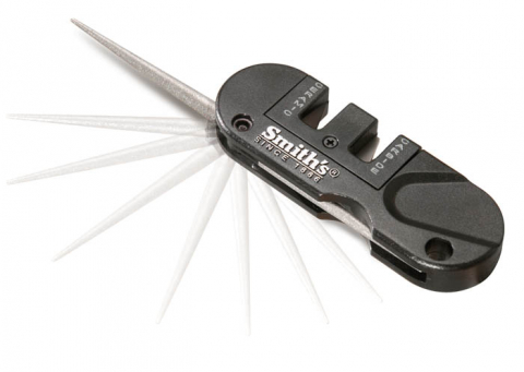 Smiths new Pocket Pal Multi-Functional Knife Sharpener features pre-set crossed carbides and ceramic stones, which provide the Perfect Edge every time. Carbides provide quick edge setting, and the specially shaped ceramic stones are designed to give you a razor sharp edge on either standard or serrated edges. A fold out, tapered round, diamond coated rod is designed for sharpening serrations and small gut hooks. Unit is compact, lightweight, durable, and comes with a lanyard hole.