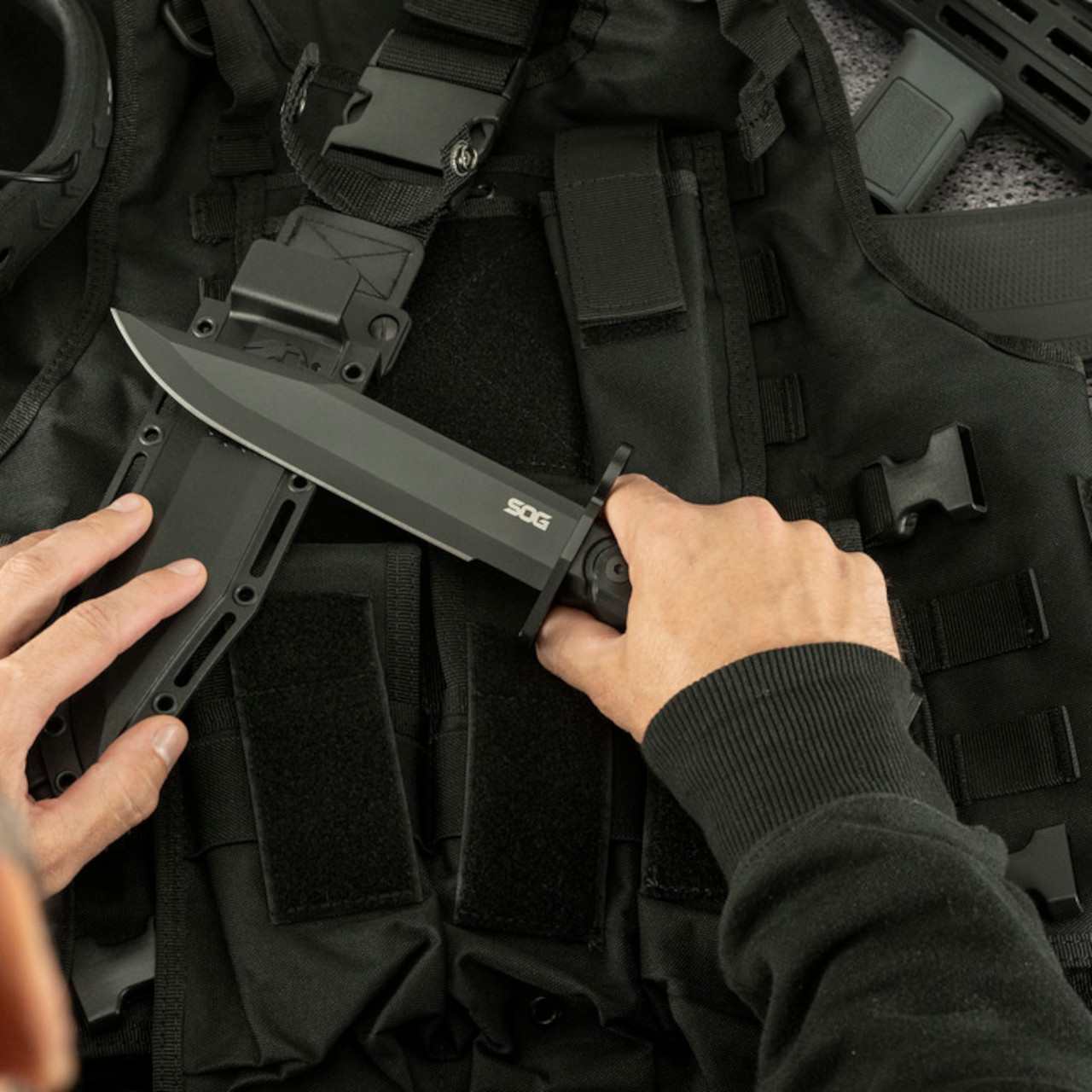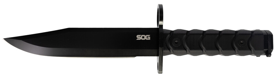 The SOG BAR15T BY1004-BX, Black PVD AUS-8 Clippoint, Black G10 fixed knife features a handle made from G10. This is a composite material made of glass
