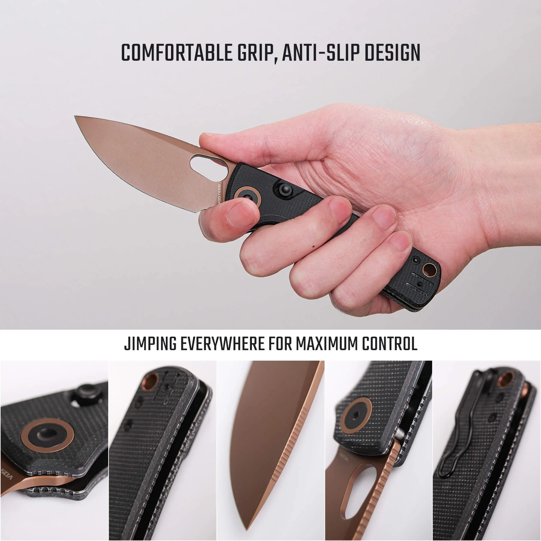 - Jimping ensures maximum grip and control at all key touchpoints.